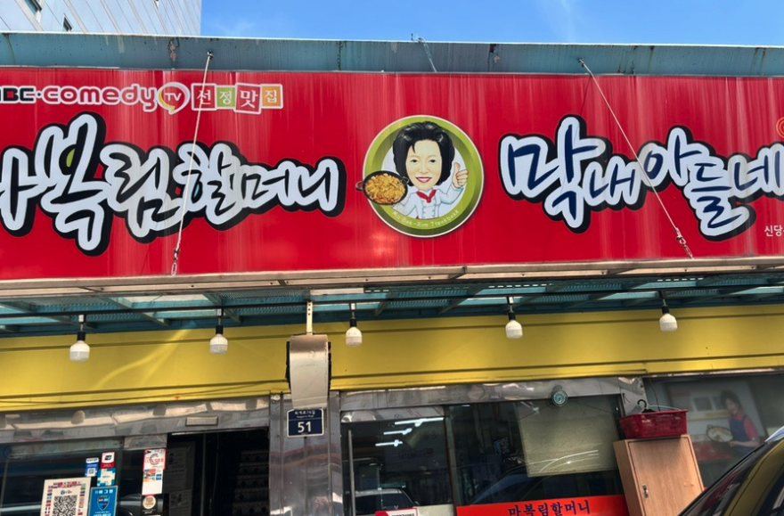 수많은 떡볶이집 간판이 즐비한 신당동 떡볶이 타운 입구에 도착하니, 고소하고 매콤한 떡볶이 냄새가 코끝을 스쳤습니다. 이 냄새만으로도 벌써 침샘이 폭발하는 것 같았어요. 그 많은 집들 중에 어디를 갈까 잠시 고민하다가, 오늘은 왠지 '마복림할머니 막내아들네' 간판이 제 마음을 사로잡았습니다. 큼지막한 글씨체와 어딘가 모르게 느껴지는 푸근한 분위기, 그리고 '막내아들네'라는 이름이 주는 정겨움 때문이었을까요? 마치 친척 집을 방문하는 듯한 편안함이 느껴져 망설임 없이 발걸음을 옮겼습니다. "여기다, 여기!" 아이들도 간판을 보더니 "할머니 떡볶이 먹을래!"라며 저를 재촉했습니다.