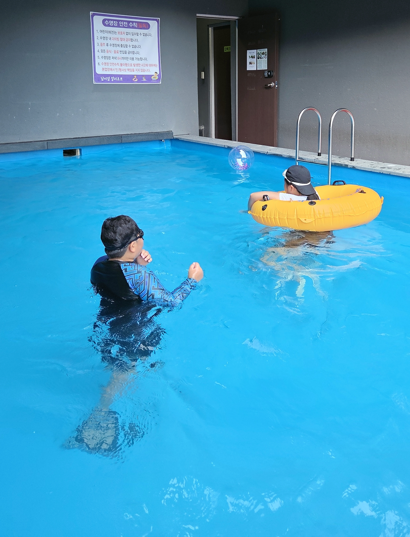 성인 허벅지 정도 깊이의 넓은 풀장은 그늘이 많아서 뜨거운 햇볕 걱정 없이 시원하게 물놀이를 즐길 수 있었어요. 게다가 객실 바로 앞에 가슴 깊이의 수영장이 따로 있어서 언제든 편하게 풍덩 뛰어들 수 있다는 점이 정말 매력적이더라고요! 🏊♀️