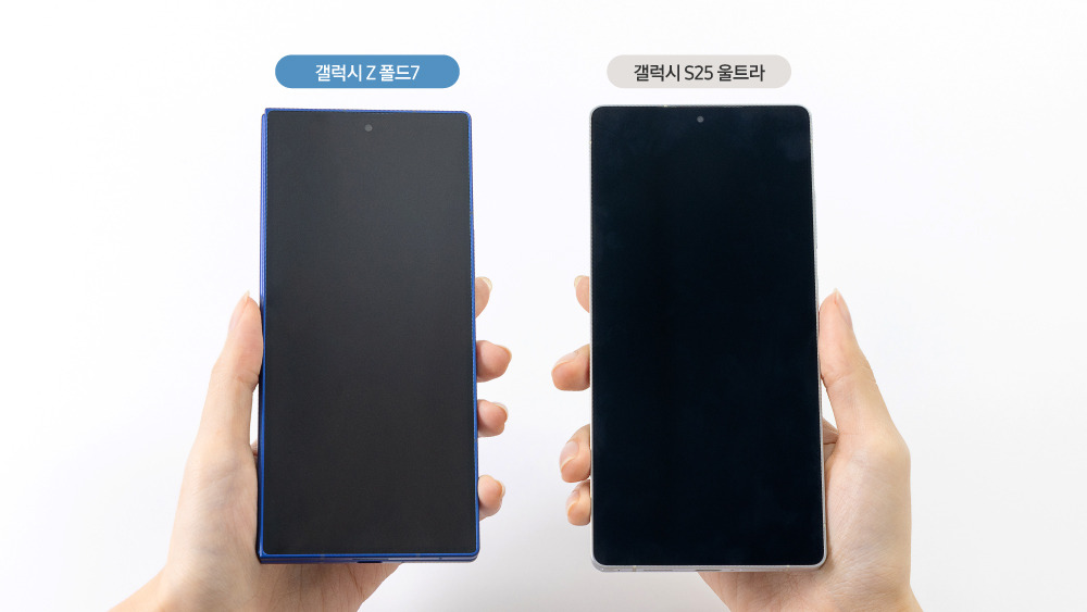 - 놀라운 경량화: 무게 역시 혁신적입니다. 폴드 6가 239g으로 이미 가벼워졌다고 평가받았는데, 폴드 7은 여기서 또다시 무게를 줄여 215g (실측 217g)을 달성했습니다. 이 수치는 갤럭시 S25 울트라(218g)나 아이폰 16 프로 맥스(227.3g)보다 가벼운 무게입니다! '접히는 스마트폰'이 '접히지 않는 플래그십'보다 가볍다는 사실이 믿어지시나요? 과거 무거웠던 폴드 3(271g)를 생각하면, 이번 Z 폴드 7의 '다이어트'는 부품 하나하나 1g씩 줄여나간 장인 정신의 결과라고 할 수 있습니다.