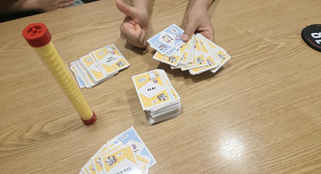 카드를 뒤집는 순간, 5초 안에 질문에 해당하는 단어 3가지를 외쳐야 하는 순발력 게임이죠! '하늘에 있는 것 세 가지!', '빨간색인 것 세 가지!' 같은 질문에 초 단위로 답을 생각해내야 했어요.