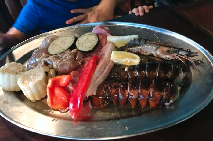 도착하자마자 눈앞에 펼쳐진 시원한 바다 뷰에 절로 감탄사가 나왔습니다. 테이블 바로 앞에서 철판에 신선한 해산물과 고기를 구워 먹는 방식인데, 비록 저희가 갔을 때는 구름 때문에 선명한 일몰은 보지 못했지만, 그래도 서서히 붉게 물들어가는 하늘을 배경으로 식사를 하니 그 자체가 낭만이었습니다.