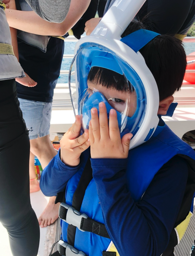 바다 안으로 들어가 스노클링까지 즐길 예정이라, 저희 가족 모두 물놀이 복장으로 완벽하게 풀 세팅하고 배에 올랐어요. 파란 하늘과 맞닿은 푸른 바다가 우리를 반기는 듯한 기분! 배 위에서 바라보는 괌의 풍경은 그 자체로 그림 같았습니다.