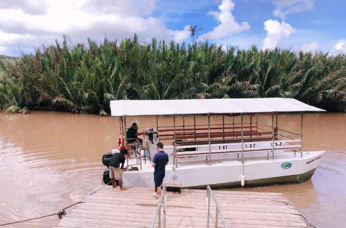 구명조끼를 입고 이렇게 생긴 배를 타고 정글 탐험하러 갑니다.